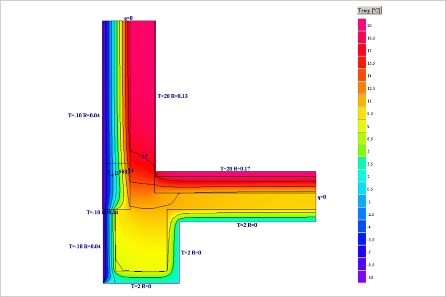 - Výpočty lineárních i bodových tepelných mostů včetně grafického zobrazení stanovení oblasti kondenzace za pomoci specializovaného softwaru